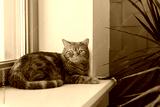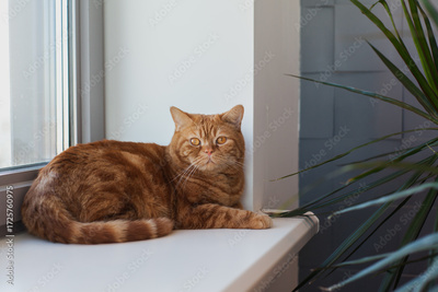 Big orange Scottish Fold cat lies on window in a new apartment. Day light. Concept of pet care, veterinary clinics, home comfort, coziness, and well-being