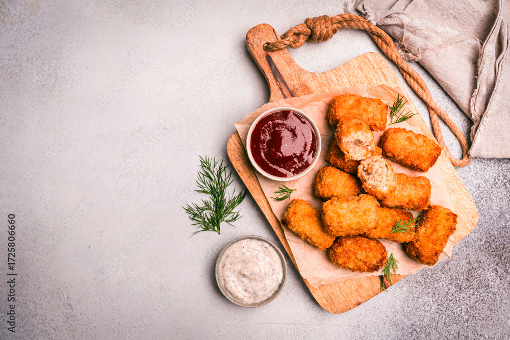 Delicious Potato Croquettes - mashed potatoes balls with grated mozzarella cheese seasoned with spices, breaded and deep fried in olive oil, served with sauce, view from above