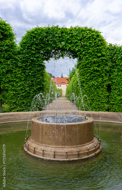 Fountain in Prague's Wallenstein Garden with Green Arch.