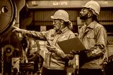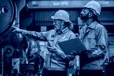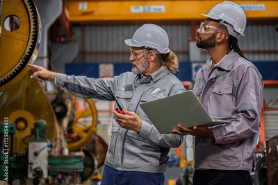 Industrial engineers wearing safety gear inspecting heavy machinery in a modern factory. Factory management, technical maintenance, and engineering teamwork in manufacturing industry.