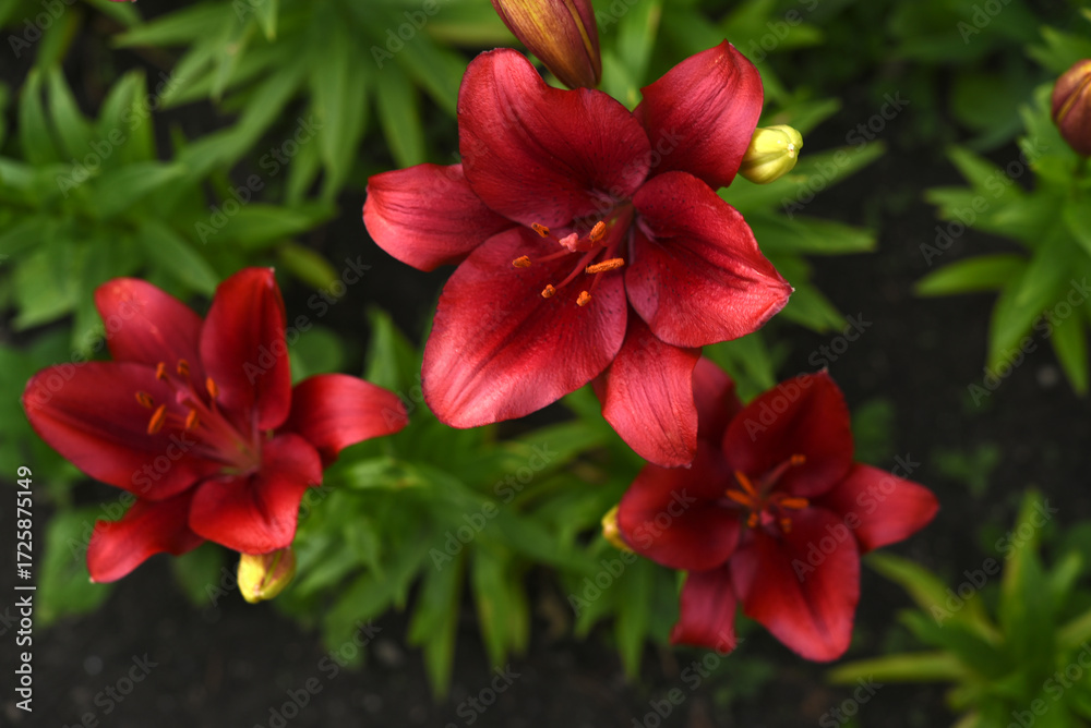 Red lilies with stripes close-up. Beautiful bright red lilies in the garden in summer. A large lily flower.