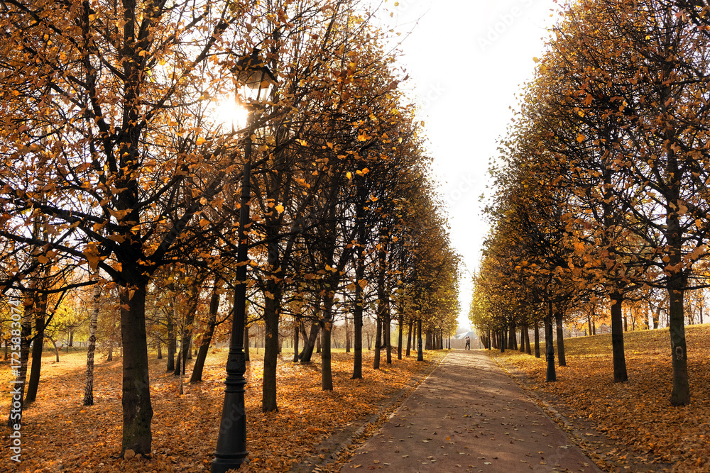 Beautiful autumn sunny park. fall season nature background. picturesque landscape with bright orange foliage trees and golden leaves on alley in city park