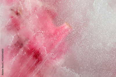 Smoke soft focus pink flower petal through glass with frozen ice. Abstract natural blur wet background.