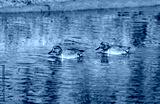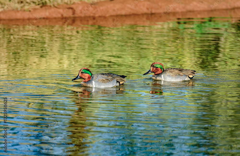 A pair of green-winged teal ducks swim in a pond near Phoenix Arizona