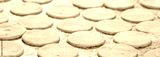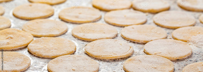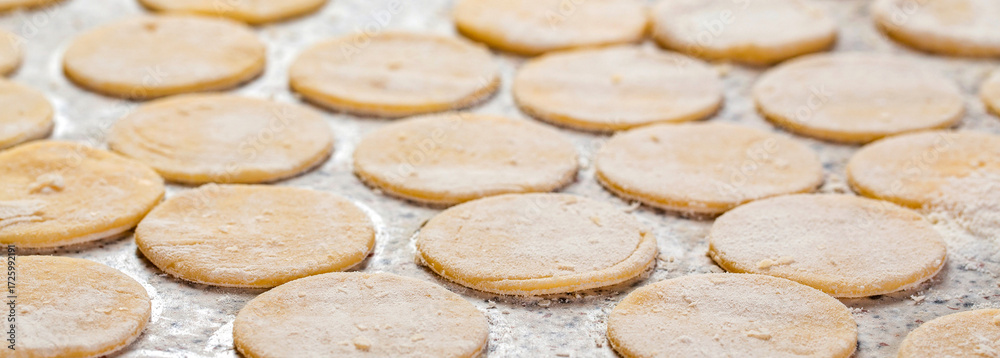 Many cookie doughs cut out in a circle shape on a table, flour. Cookie blanks, dough formed into circles on the production table in the bakery. Process of making cookies