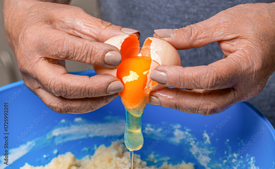 Hand, egg in bowl. Woman breaks egg above flour to make dough. Male hand breaks egg into flour while making dough