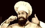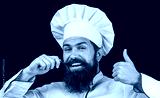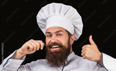 Bearded chef, cooks or baker positive gesture with hand, thumbs up smiling and happy for success. Happy chef cook young man with beard showing thumbs up gesture, smiling