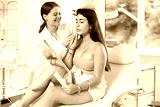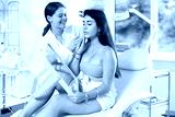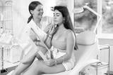 Young female aesthetic specialist consulting brunette girl sitting at examination couch at beauty clinic