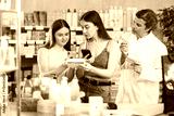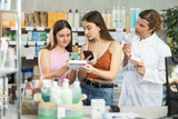 Mother and daughter scan QR code on pill packaging at drugstore. Male pharmacist offers to buy pills