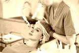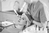 Adult woman cosmetologist performs rejuvenating facial procedure to young woman client