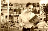 Young girl buyer chooses different sweets in grocery store