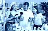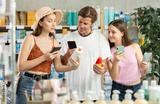 Father, mother and daughter choose sunscreen together - scan the QR code on the package