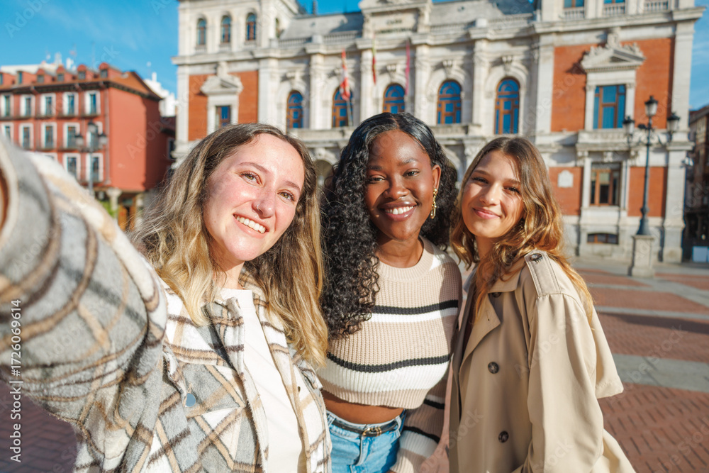 Diverse women friends taking selfie in city square