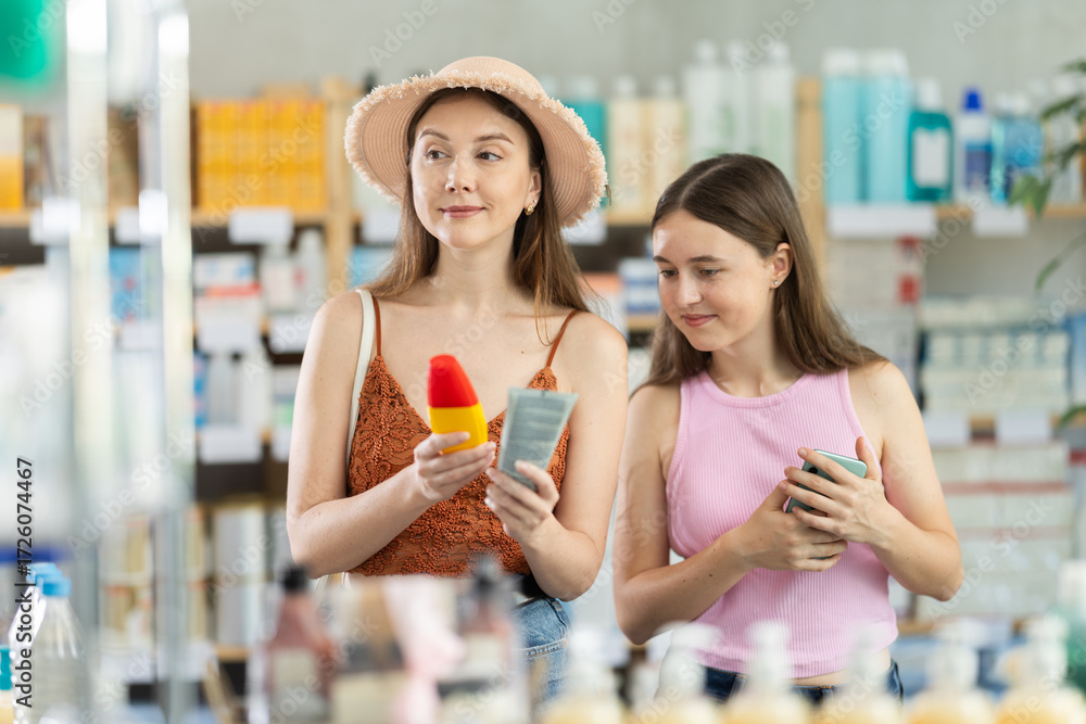 Young woman with daughter buyers choosing sunscreen or tanning product in pharmacy