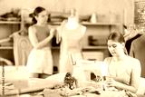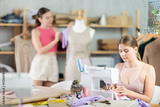 Two qualified dressmakers work in a sewing workshop against the backdrop of racks with fabrics and sewing accessories. Young women at a sewing workshop.