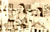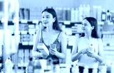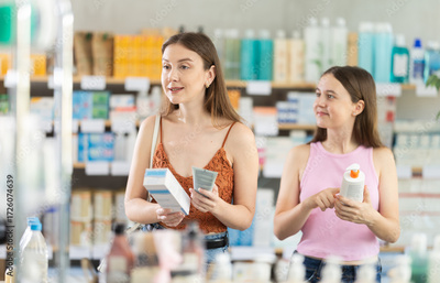 Young mother with a teenage daughter carefully chooses a moisturizing and regenerating cream for sensitive skin. Woman and her daughter buy a cream for pigment spots at a pharmacy