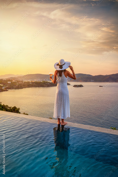 A elegant woman standing by the swimming pool enjoys the golden summer sunset behind the mediterranean sea with a glass of wine