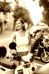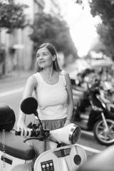 At parking lot, woman starts moped and starts ride around European capital city. Independent travel and movement around city. At moped parking, woman rents vehicle .