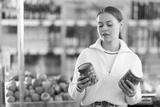 Female buyer holds Greek olives in glass jars and chooses thoughtfully. Supermarket visitor came for natural olives for salad