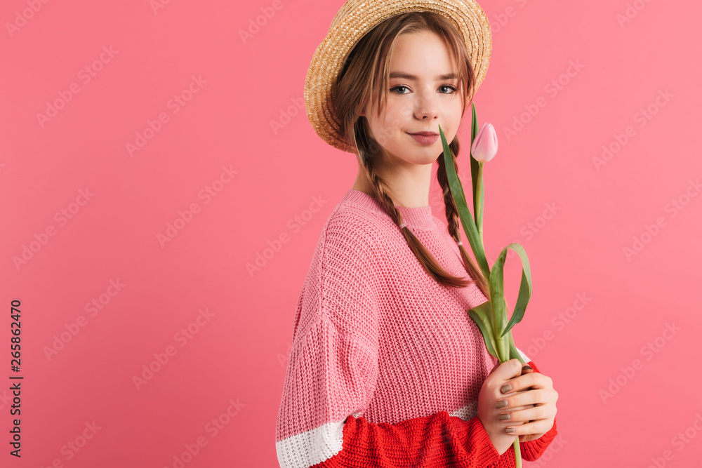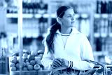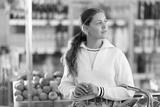 Brunette woman with long hair choosing groceries in supermarket. Customer walks around with a food basket and makes purchases in a store