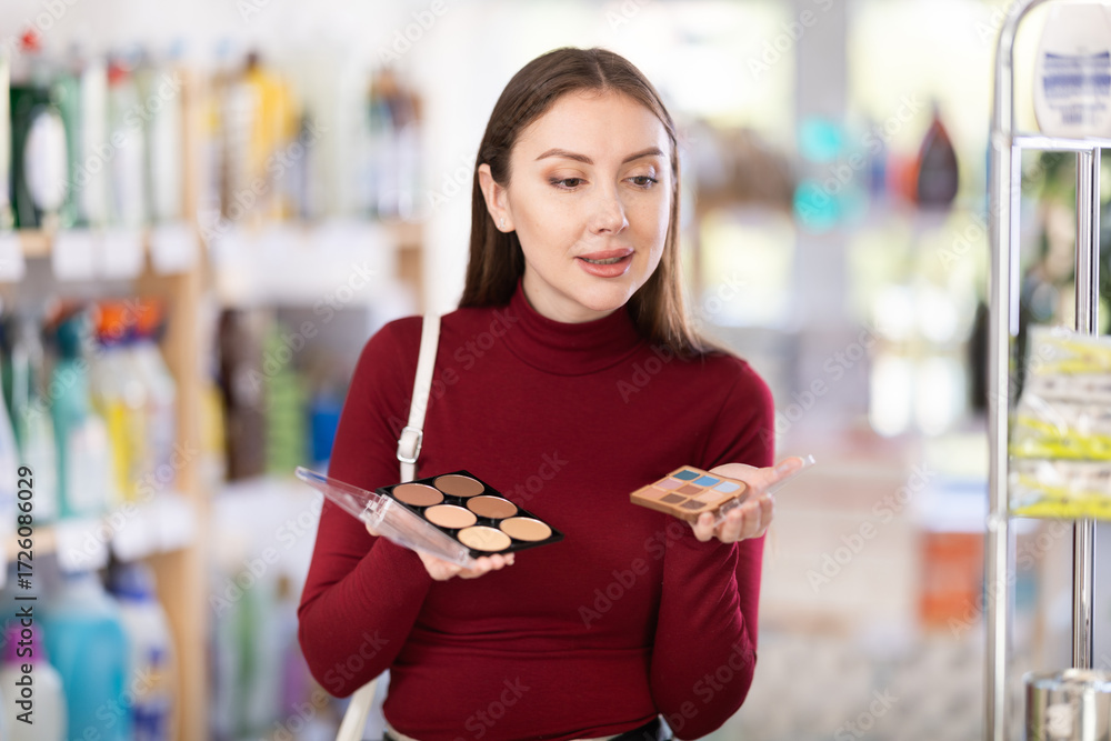Young woman buyer chooses eyeshadow and sculptor palette in household chemicals store