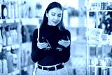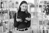European woman holds induction surface cleaners and glass-ceramics in her hands in a household store. Customer looks at the labels of cleaning products