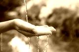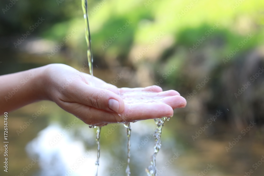 Save water concept. Woman holding her hand under flowing clean water near river outdoors, closeup