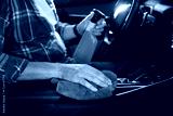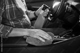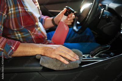 Man wiping car center console with grey microfiber rag in salon, closeup