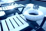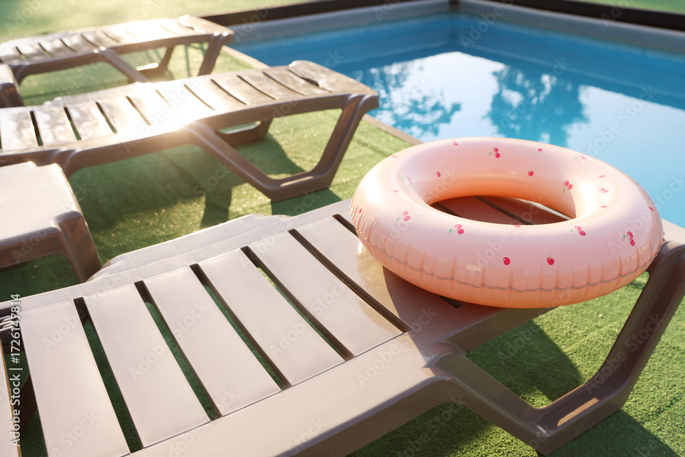 Pink inflatable ring on sun lounger near swimming pool outdoors, space for text