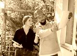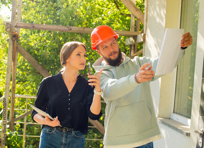 An architect and a foreman discuss plans at a construction site. A professional man with a beard in an orange helmet and a businesswoman with a tablet and smartphone consult, inspect, and check