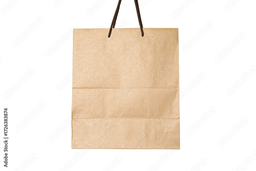 A brown paper shopping bag with handles is shown, isolated on white, PNG