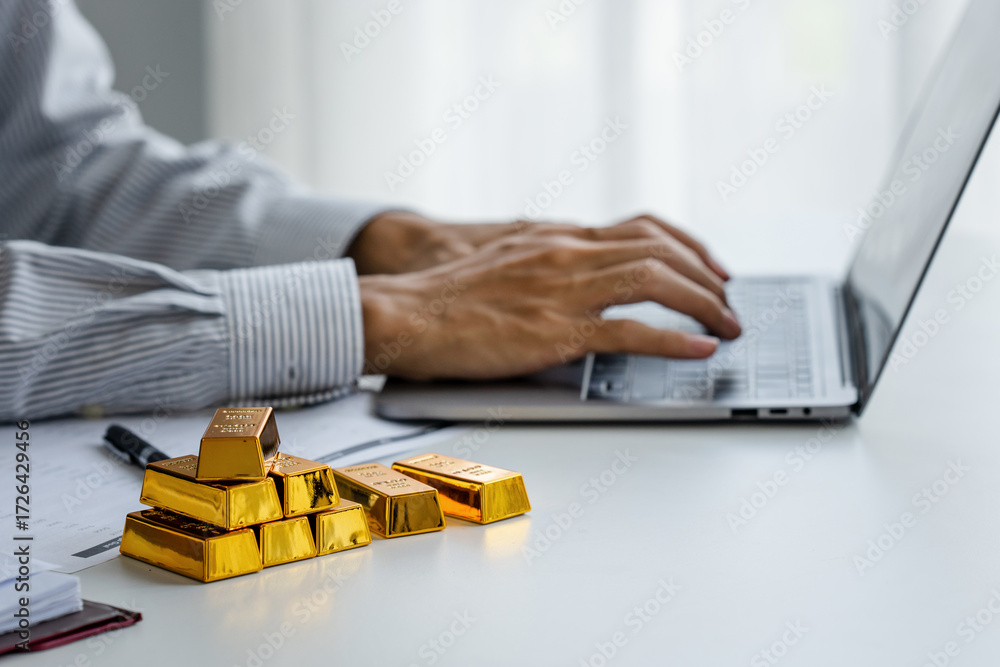 businesswoman with gold ingots discussing investment portfolio in office environment