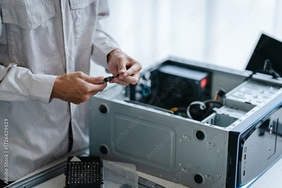 technician fixes computer PC components in a technical lab