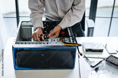 technician troubleshoots PC hardware issues in a technical engineering lab