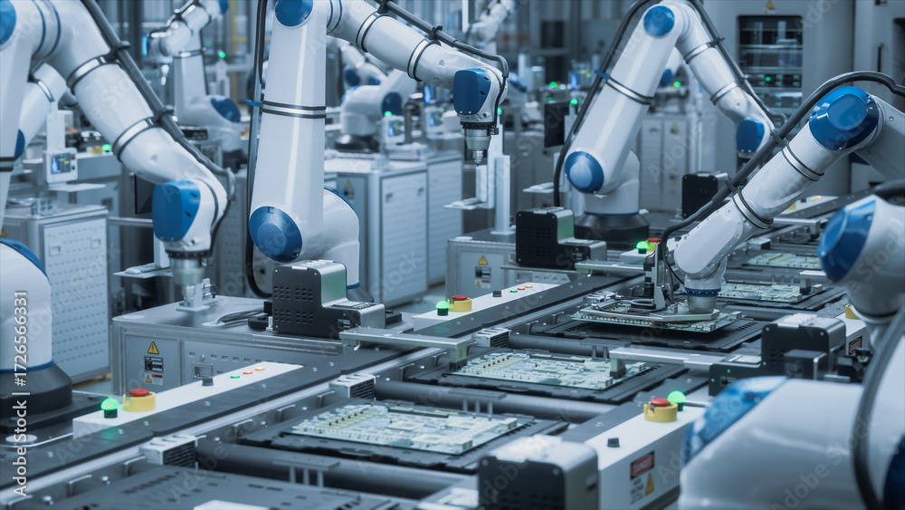 Robotic Arms Automate Circuit Board Assembly Inside a Smart Factory. Factory Floor with Automatic Conveyor is Powered by an Artificial Intelligence Software Without Human Help and Assistance