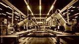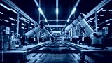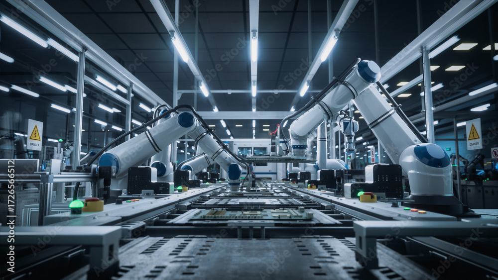 Innovative Manufacturing Factory with Industrial Robots Producing Circuit Boards in an Automated Factory. Advanced Facility Building Microelectronics Components with Robotic Arms