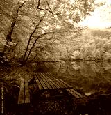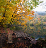 A wooden picnic table by the lake in autumn with a colourful forest reflection. Yedigöller National Park - Bolu, Turkey