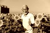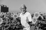 Senior Worker in Sunflower Field Giving Thumbs Up
