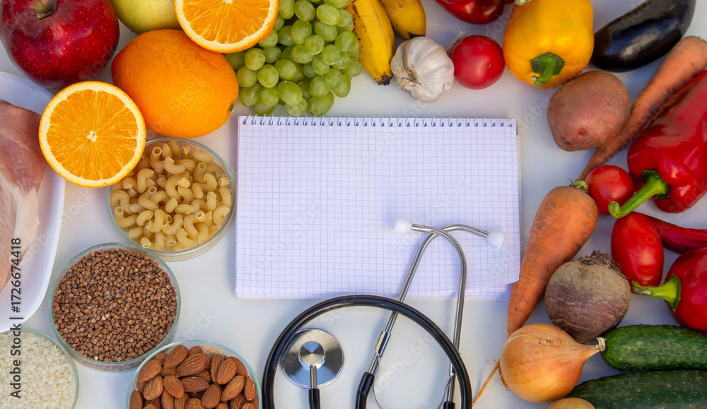 Diet Planning: Stethoscope, Notebook, and a Balanced Selection of Food