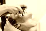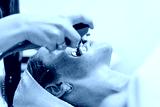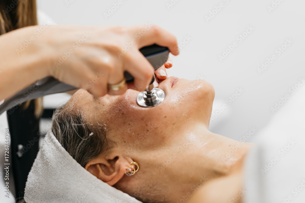 Woman receiving RF lifting treatment for facial rejuvenation, lying on treatment bed, with professional equipment and soothing ambiance in a modern spa environment