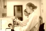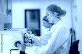 Female medical laboratory technologists in full protective gear work efficiently in a row, operating specialized equipment to process biological samples in a bright, modern clinical lab.