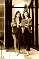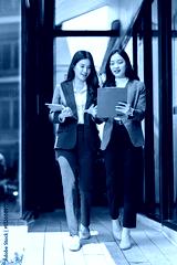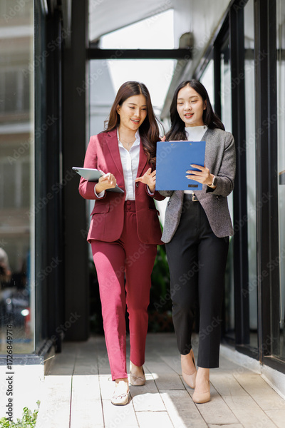 Two Asian business people walking street at business office center.Young business corporate team meeting in a business park.Leadership,coaching and group of people Discuss meeting