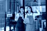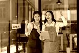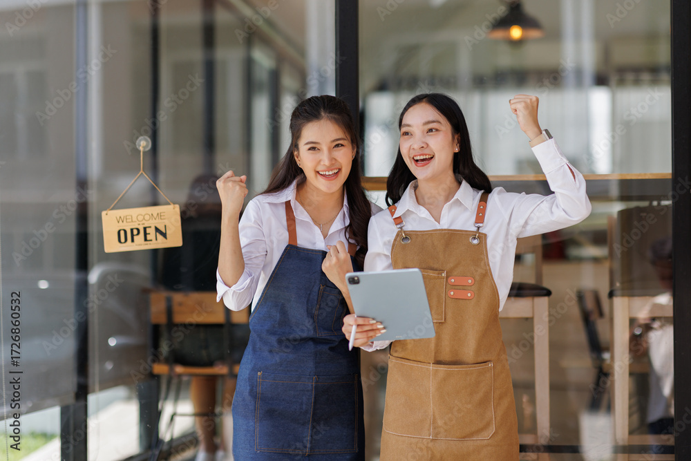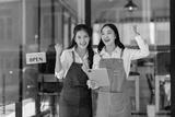 Portrait of two asian tan women barista wearing apron standing in open sign cafe. business owner employee Barista entrepreneur. SME entrepreneur seller business concept