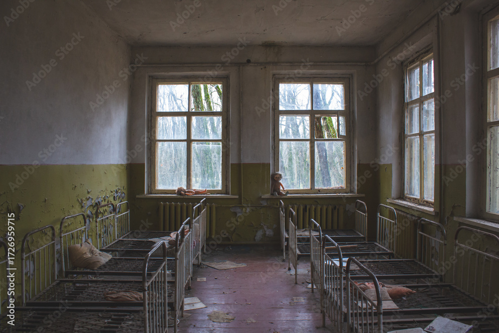 Desolate room in Chernobyl Nuclear Zone, with abandoned cots amidst chaos. Peeling paint and debris evoke a somber atmosphere. Possible old hospital setting, in decay.