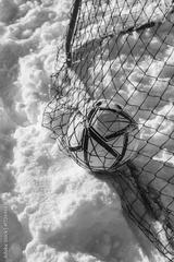 Soccer ball trapped in snowy goal net on a bright winter day