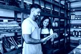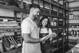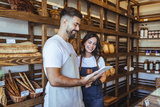 Happy Couple in Cozy Bakery Shop Browsing Tablet Amid Fresh Bread and Pastries