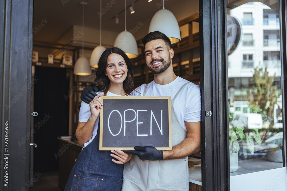 Open Sign Moment: Happy Couple Owners Welcome Guests at Cozy Local Coffee Shop