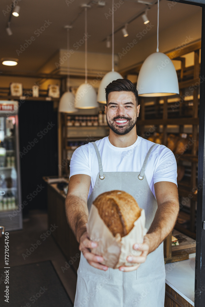 Smiling Baker in Apron Offering Fresh Bread at Cozy Neighborhood Bakery Entrance