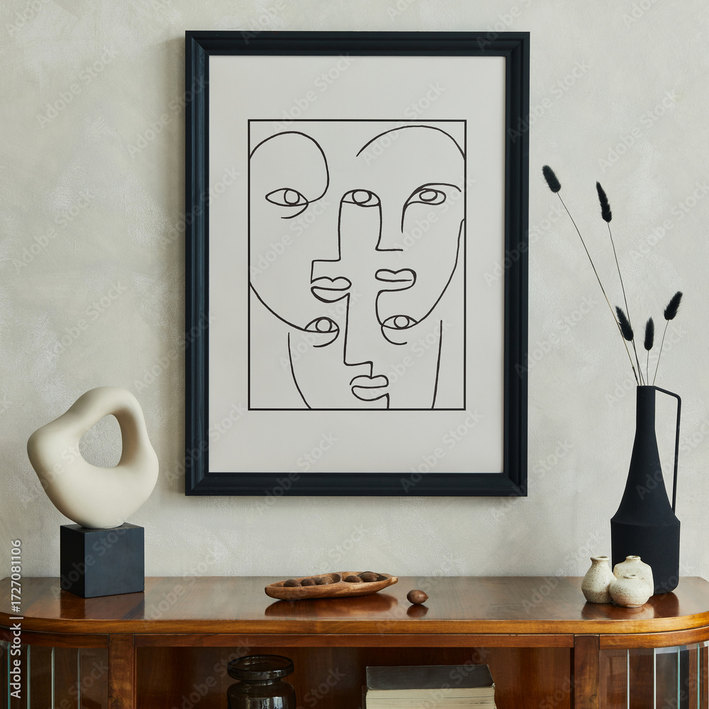 Stylish minimalistic composition of creative living room interior with mock up poster frame, dry flowers in black vase and creative sculpture on the wooden commode. Neutral beige wall. Template.