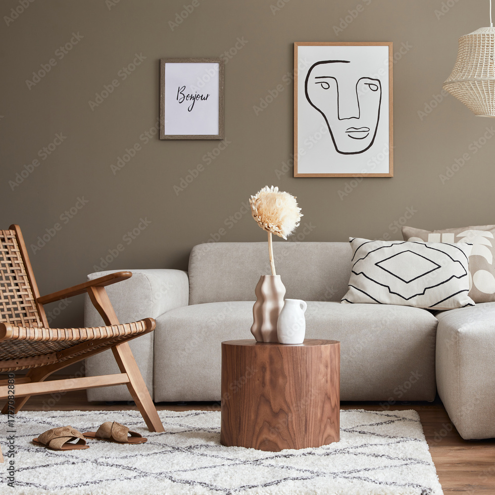 Stylish interior with design neutral modular sofa, mock up poster frames, rattan armchair, coffee tables, dried flowers in vase, decoration and elegant personal accessories in modern home decor.